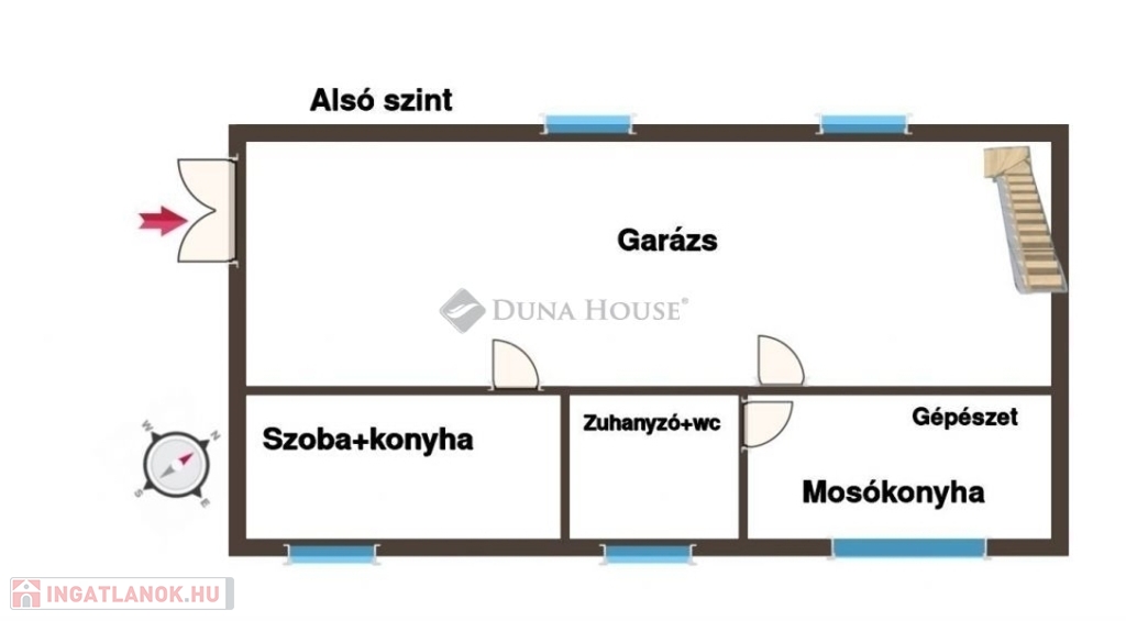 Alsó szint: 136 m², benne négyállásos garázs és külön lakrész, amely akár önálló otthonként vagy kiadásra is alkalmas.